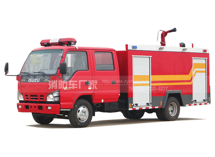 五十鈴2.5噸水罐消防車,采用五十鈴600P國五底盤,雙排駕駛室,底盤型號QL1070A5KWY,發動機型號4KH1-TCG51,五十鈴130馬力發動機,標配7.00R16鋼絲胎,軸距3815mm.