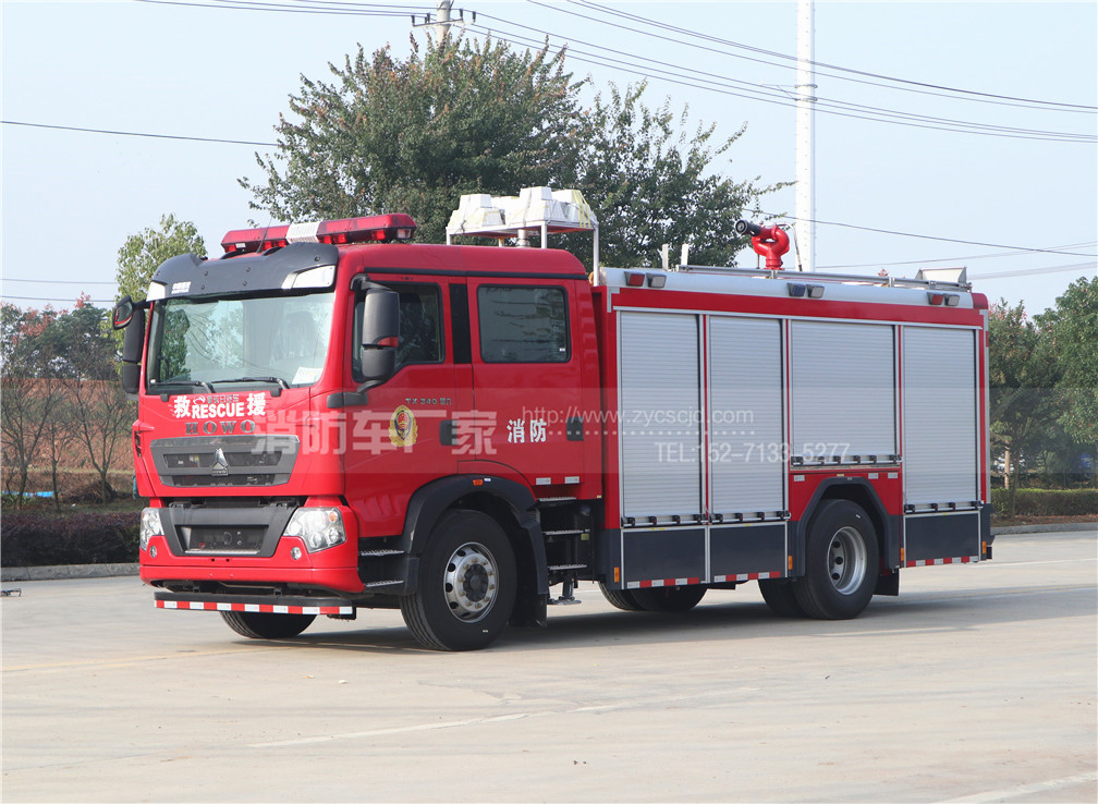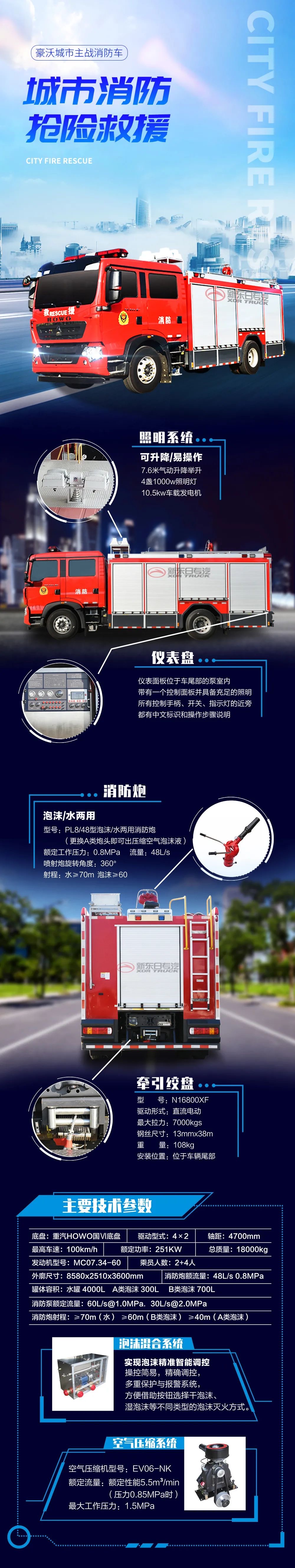 豪沃單橋城市主戰消防車采用中國重汽集團濟南卡車股份有限公司生產的ZZ5207TXFV471GF5型二類汽車底盤, 該車原裝雙排駕駛室,可載含駕駛員在內的乘員6人,駕乘舒適輕便。該車采用DC-CAFS60/45M型集成壓縮空氣泡沫滅火系統,該壓縮空氣泡沫系統操控簡易,泡沫生成實現即時全自動微機精確調控,并設多重保護與報警系統,消防作戰員可依據復雜的火場情況,方便地借助按鈕選擇干泡沫、濕泡沫等不同類型的泡沫滅火方式。該套系統不僅裝有A類泡沫原液,還裝有B類泡沫原液,可高效率地撲滅和控制A、B類物質火災,并具備良好的環保性能。另外該車配置有牽引電動絞盤,7.6米氣動升降舉升4*1000w照明燈和10.5kw車載發電機,使得該車還可獨立開展偵查、破拆、救生、照明、防護等綜合搶險救援功能。
